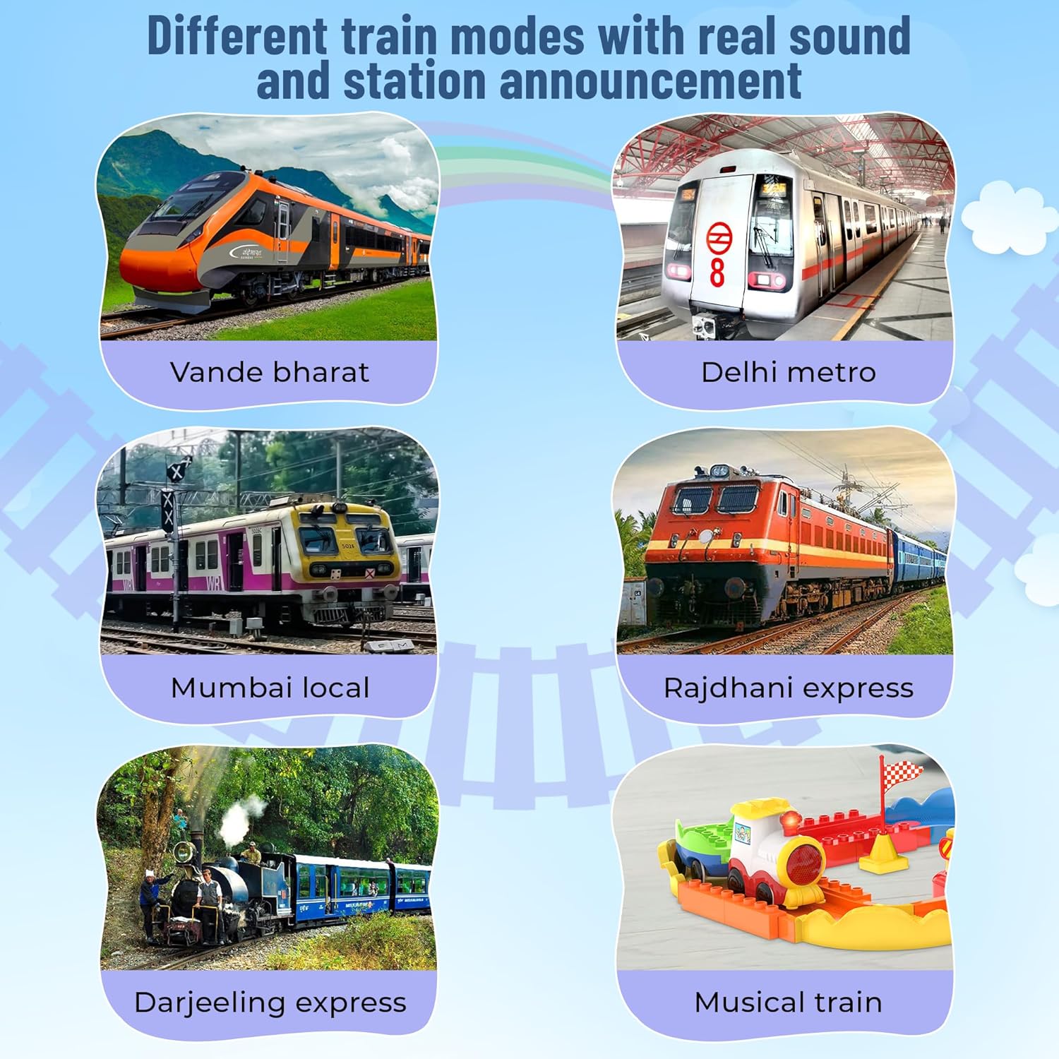 - Multiple Track Layouts for Endless Fun: Design your own unique railway routes with this toy train set featuring easy interlocking track pieces. Explore different configurations every time for hours of creative play. Different Train Modes with Real Sound Effects: Bring the magic of the railway to life with real train sounds and station announcements. Your kids will enjoy an authentic train experience in their own playroom.